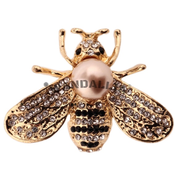 Drobne kryształki imitujące malutkie diamenty oraz czarny onyks zakuto na prawie całej powierzchni broszki. Całość dopełnia okazała sztuczna perła, która się wyróżnia na tle całej broszki.